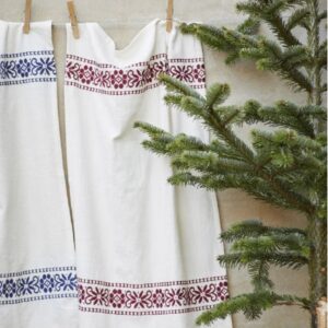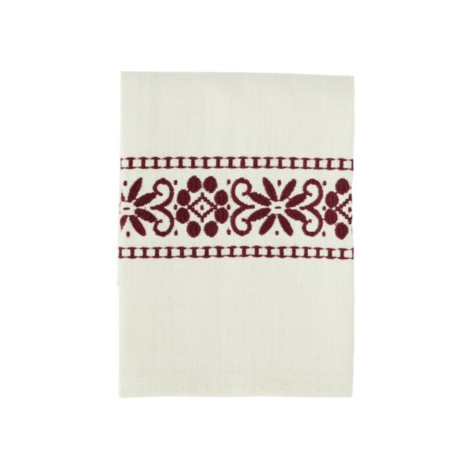 Αυτή η κεντημένη πετσέτα κουζίνας προσθέτει μια παραδοσιακή πινελιά στο χώρο σας .Με ένα εντυπωσιακό σχέδιο γεωμετρικών μοτίβων και λουλουδιών σε βαθύ κόκκινο χρώμα , συνδιάζει την ομορφιά της χειροποίητης τέχνης με τη χρηστικότητα της κουζίνας . Η λεπτομερής κεντητή διακόσμηση στο κέντρο της πετσέτας δίνει έμφαση στην ποιότητα και την φροντίδα με την οποία έχει κατασκευαστεί , ενώ το πλούσιο χρώμα και το περίτεχνο σχέδιο θυμίζουν παραδοσιακές τεχνικές κεντήματος που αναδεικνύουν την ελληνική παράδοση.