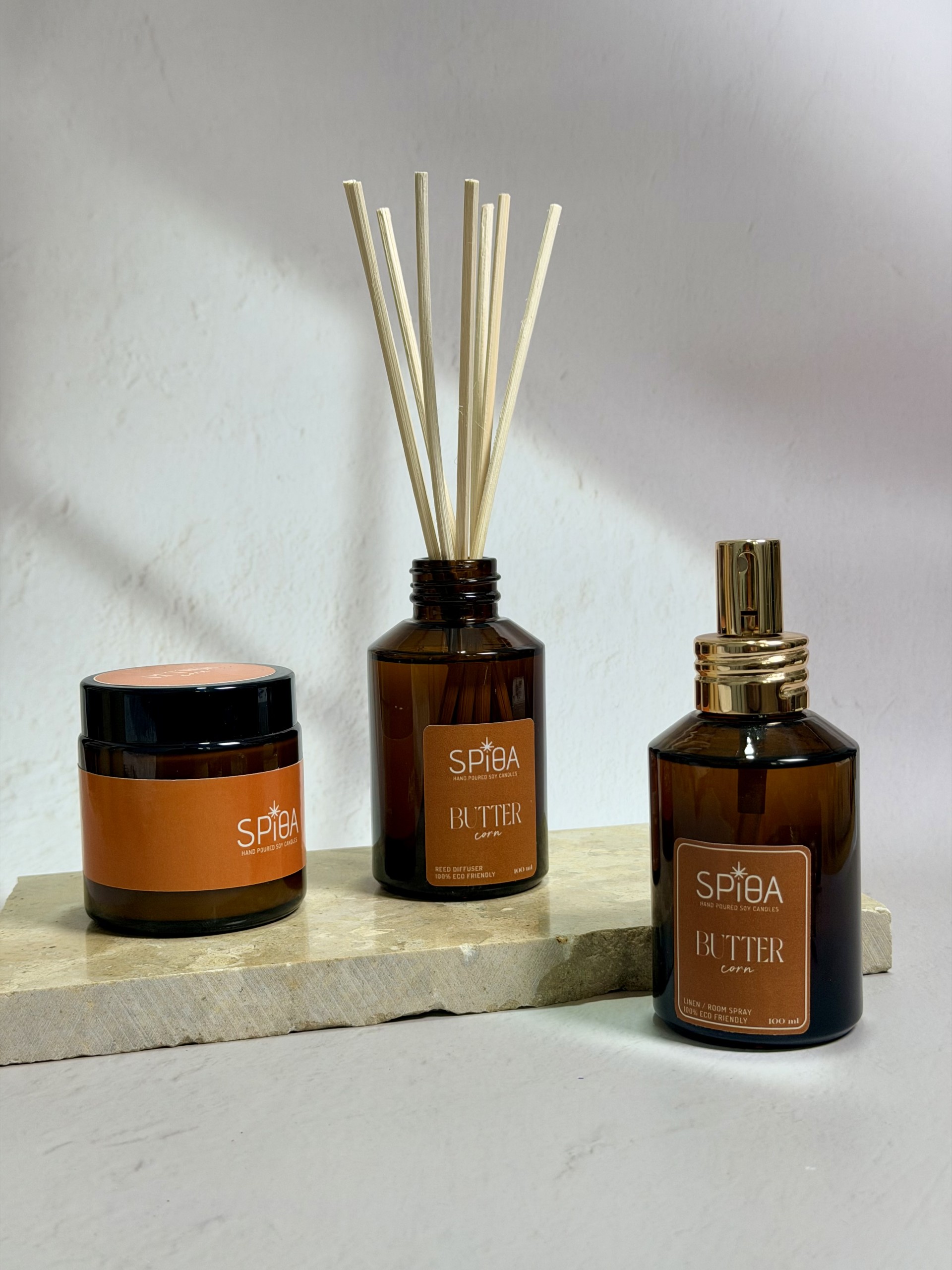 complete home set (αρωματικό κερί , σπρέι υφασμάτων,αρωματικό χώρου) με άρωμα butter corn