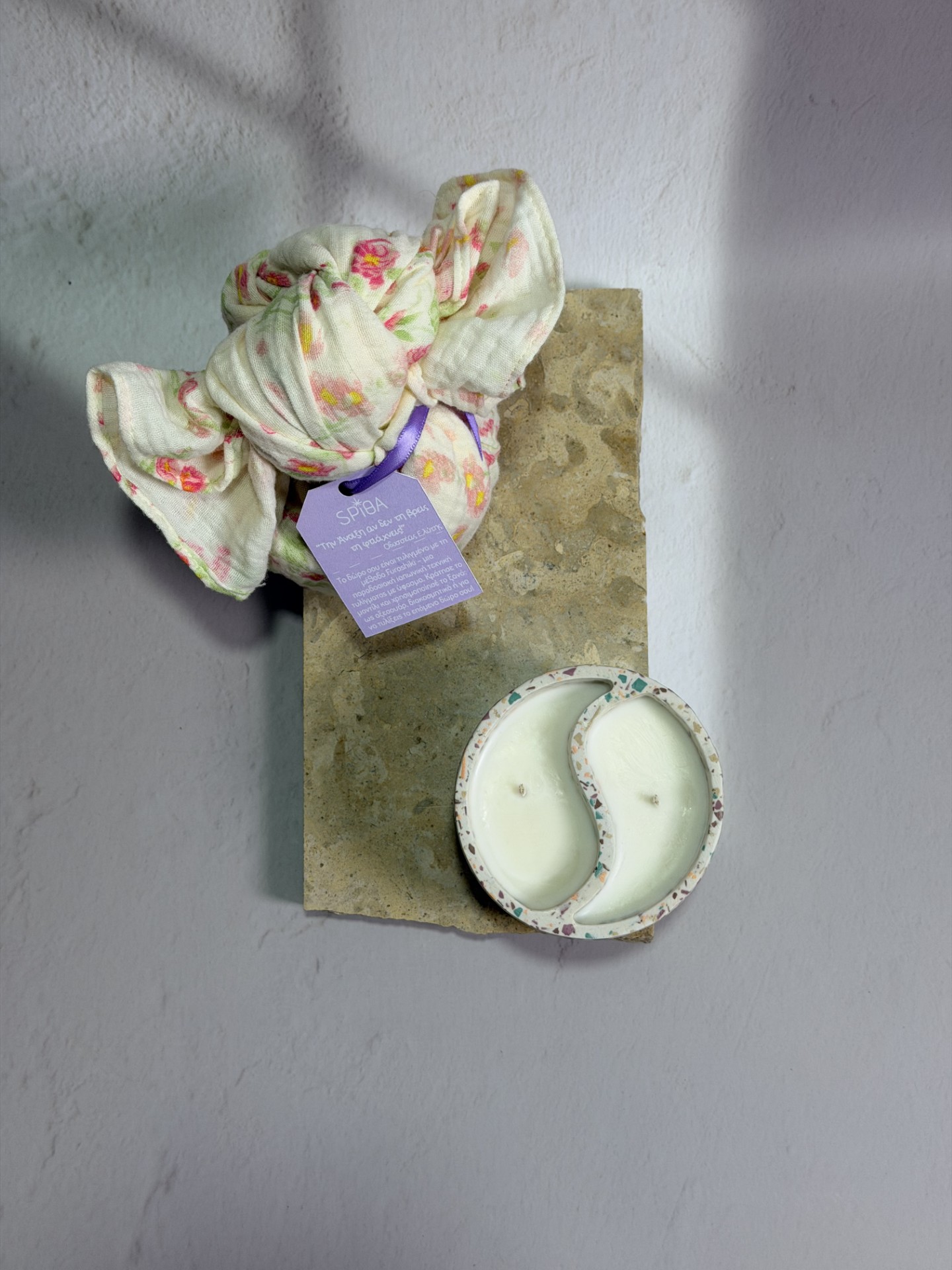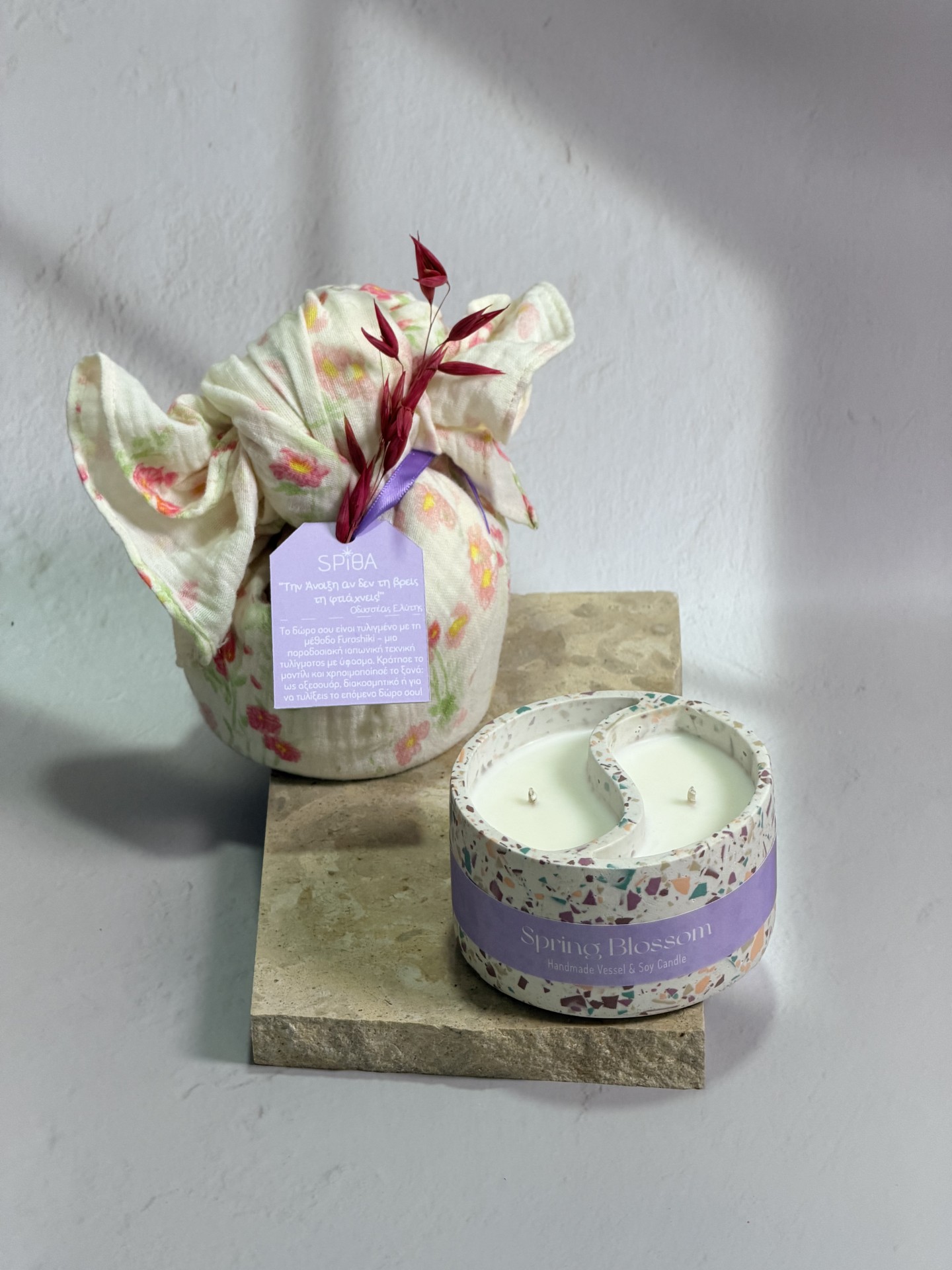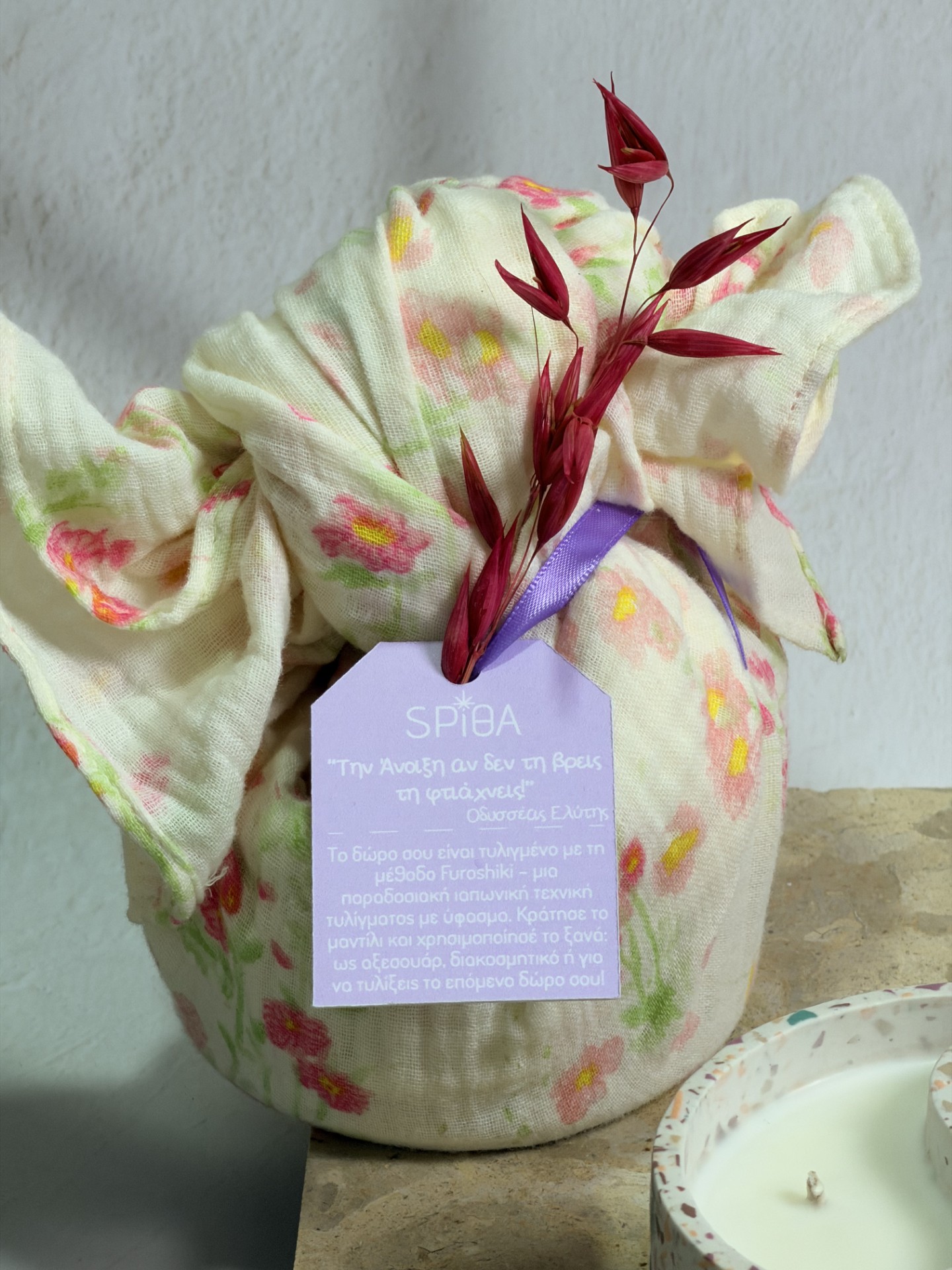 Η εμπειρία ολοκληρώνεται με ένα ξεχωριστό τύλιγμα εμπνευσμένο από τη μέθοδο furoshiki, χρησιμοποιώντας ένα υφασμάτινο μαντήλι που δεν είναι απλώς συσκευασία — αλλά ένα επιπλέον δώρο.