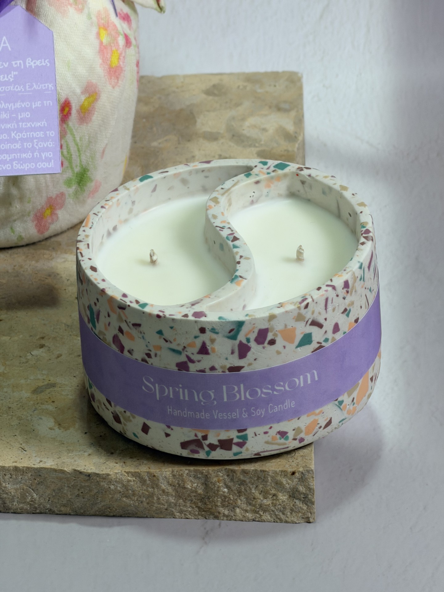 Ανακάλυψε την πιο ανοιξιάτικη εμπειρία αρώματος με ένα μοναδικό χειροποίητο αρωματικό κερί σόγιας που συνδυάζει δύο διαφορετικά αρώματα στο ίδιο δοχείο .