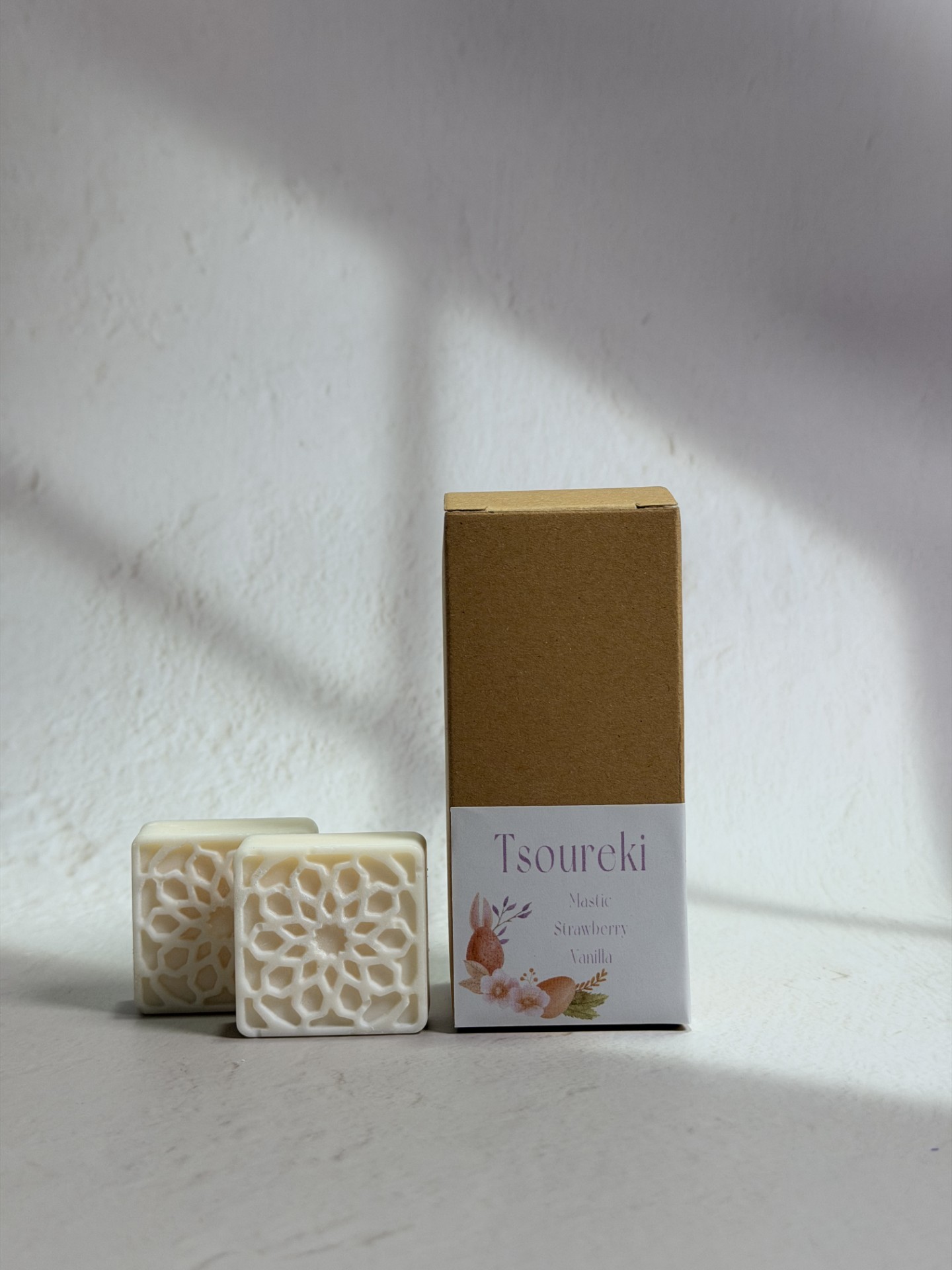 Ο συνδυασμός μαστίχας , φράουλας και βανίλιας δημιουργεί μια γλυκιά,ζεστή ατμόσφαιρα που θυμίζει φρεσκοψημένο τσουρέκι.
